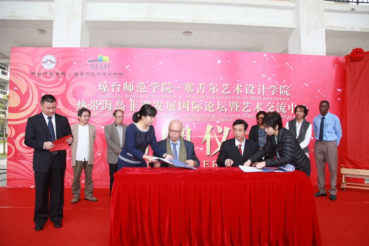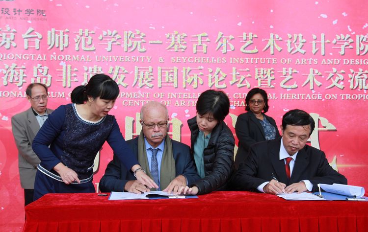 3、塞舌尔艺术设计学院与琼台师范学院签署合作意向书,合作内容包括开展师生互派、技艺培训、学术交流等。