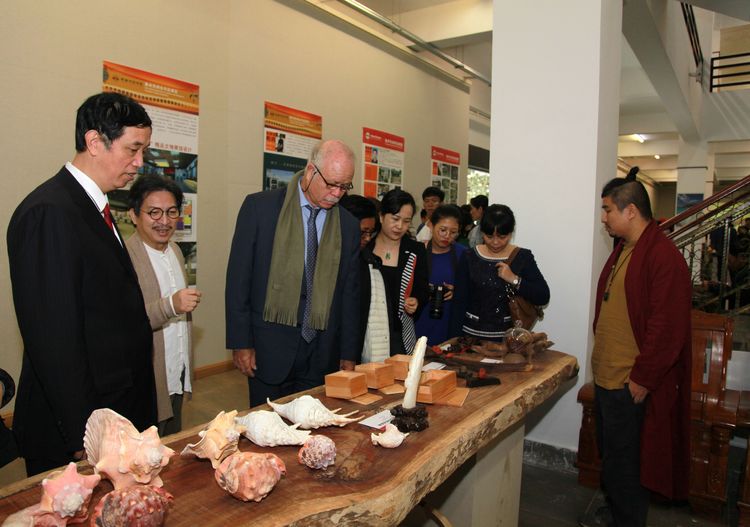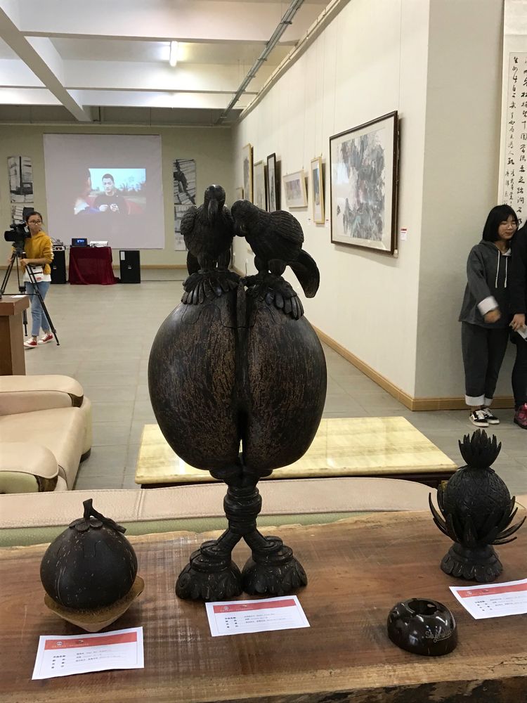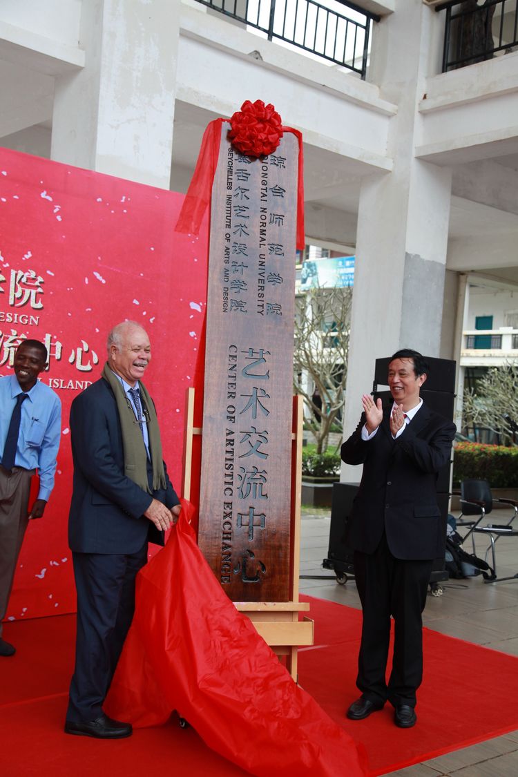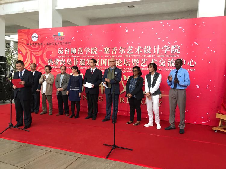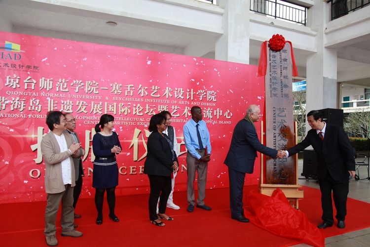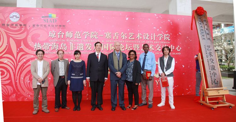 2018年12月11日上午10时30分,琼台师范学院美术楼前迎来了远方的客人,他们是非洲塞舌尔共和国维多利亚市市长大卫•安德里(Mr. David Andre),维多利亚市政厅主任莉迪亚•查理(Ms. Lydia Charlie),塞舌尔椰雕艺术家唐纳蒂安•弗雷米诺(Donatien Freminot)。本次交流中心揭牌活动由海口市外事办、琼台师范学院主办,海南省美术家协会、海南省工艺美术学会、琼台师范学院美术系承办。参加揭牌仪式的中方交流人员有海南省工艺美术学会会长、海南省非遗传人、著名椰雕艺术家吴名驹,海口市外办周中慧处长,海口市外办副主任科员林贤,琼台师范学院曹阳院长,党委委员曾德锦,海南省美术家协会副主席、琼台师范学院美术系主任符祥康,琼台师范学院美术系王海清书记,校宣传统战部郭志东部长,科研设备处吴小玲处长,质量监控中心庄小满主任,校办袁昌青副主任以及特邀研讨嘉宾、行业代表、媒体代表和琼台师范学院师生。