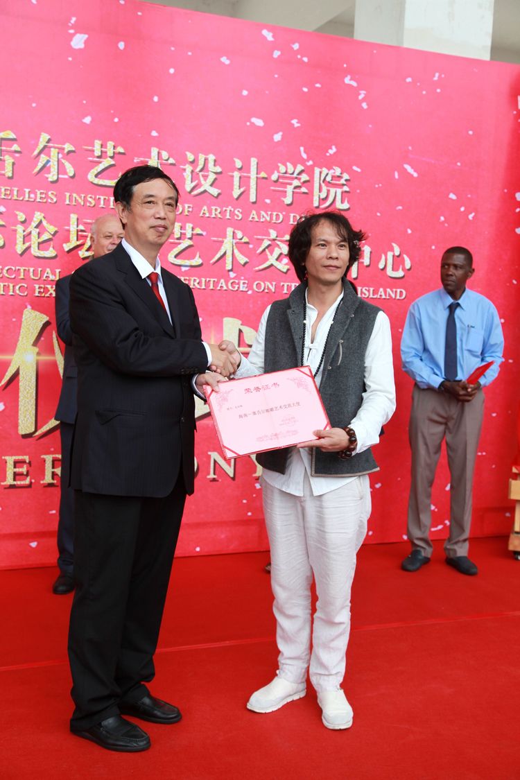 4、向塞舌尔椰雕工艺美术家唐纳蒂安•弗雷米诺和海南省非遗传人、著名椰雕艺术家吴名驹颁发交流大使荣誉证书。