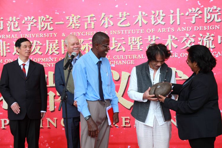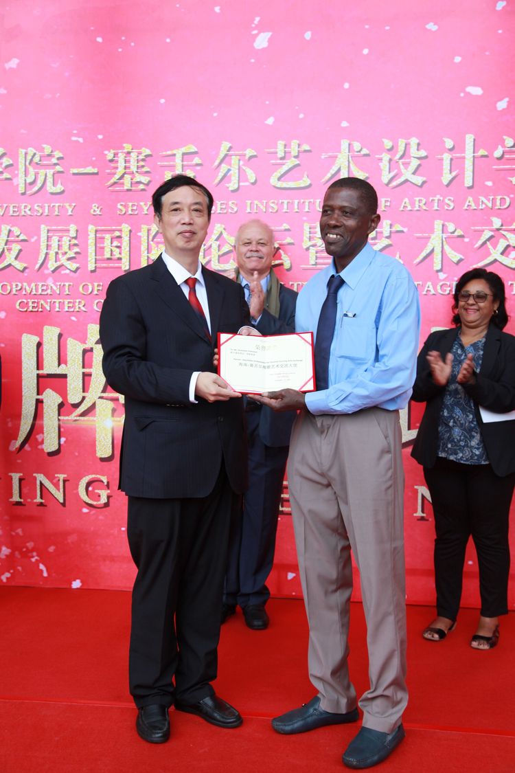 曹阳校长和塞舌尔维多利亚市市长大卫·安德里代表双方签署了在开展师生互派、技艺培训、学术交流等方面内容的合作意向书,曹阳校长还向塞舌尔椰雕工艺美术家唐纳蒂安·弗雷米诺和海南省非遗传人、著名椰雕艺术家吴名驹颁发了交流大使荣誉证书。