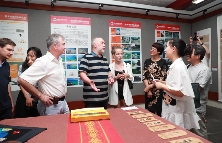 陈晖阳副院长、海南省文联副主席阮江华、海南师范大学美术学院周建宏副院长、我校美术系主任符祥康教授陪同俄罗斯列宾美院油画系主任亚历山大·瓦连京诺维奇·楚文一行参观了我校校史馆与美术专业教学成果展。教学成果展上,我校师生与列宾美院艺术家就两地绘画形式的历史、技法、魅力进行了深入的互动和交流。随后我校与列宾美院就两校的学术交流、合作办学等事宜进行了座谈。