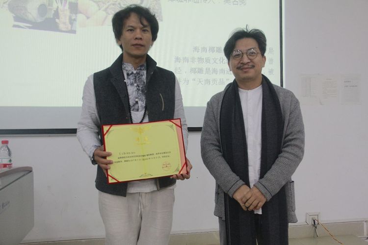 符祥康主任给椰雕非遗传人吴名驹颁发客座教授聘任证书