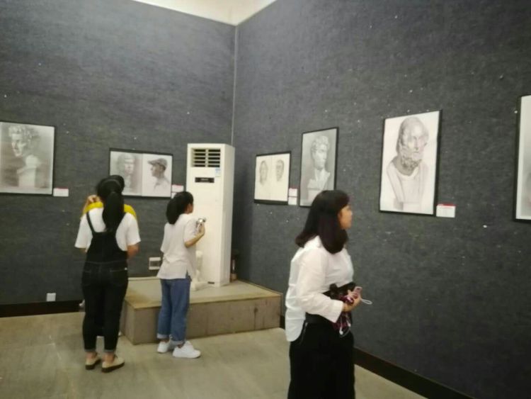 开幕式后的展览现场,学生们踊跃参观。美术教育王开继老师与学生的专业教学互动从开幕式典礼会场一直延续到展厅作品分析,其敬业精神令人感佩。