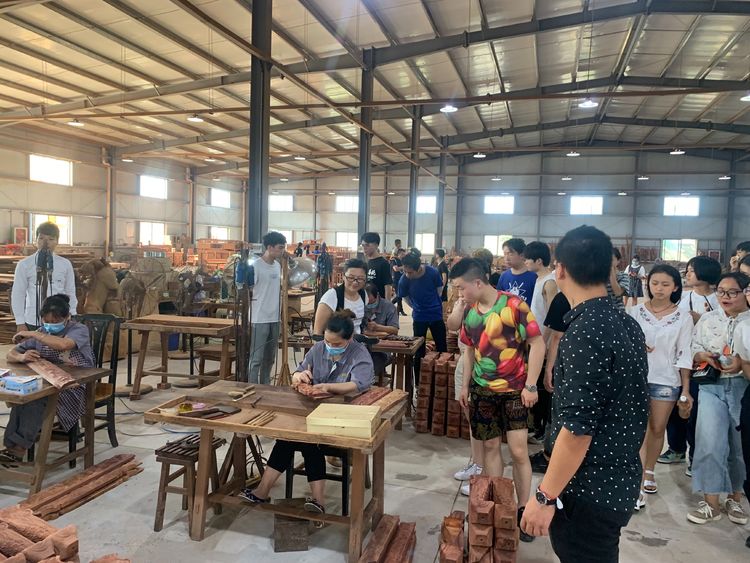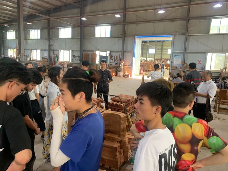 师生们在企业专家的带领和讲解下认真观看、学习工人们做的家具