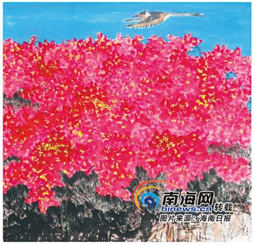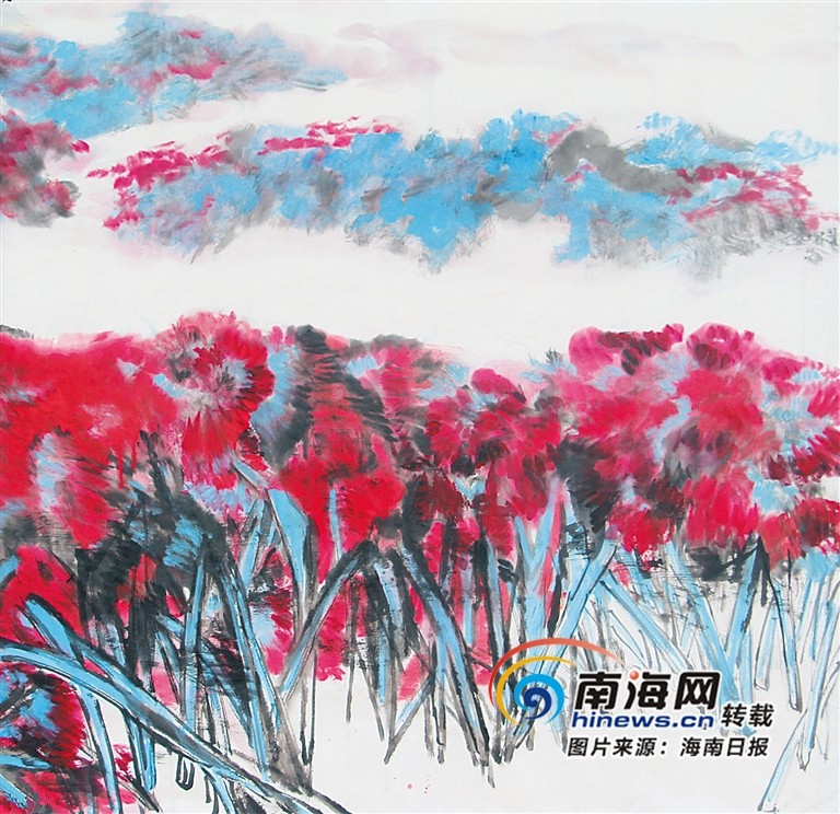 在周乃林的个展中,“彩”的绘事,让这些描绘海南地域的水墨画变得更加绚丽。长在四季常春的椰岛,感官浸润的是绿树繁花,抬头可望蓝天白云,俯视能观碧海金沙。用自己的心灵去品味纯粹的海南自然之美,用情思带动其美妙的旋律。在周乃林的笔下,每一幅水墨画作品,都在试用自己的感悟,通过笔墨彩叙述一种海南情怀。