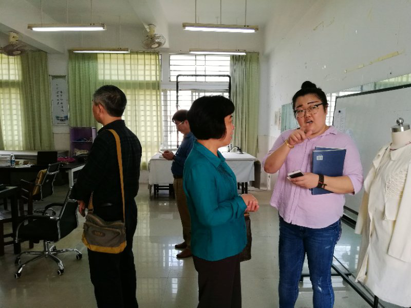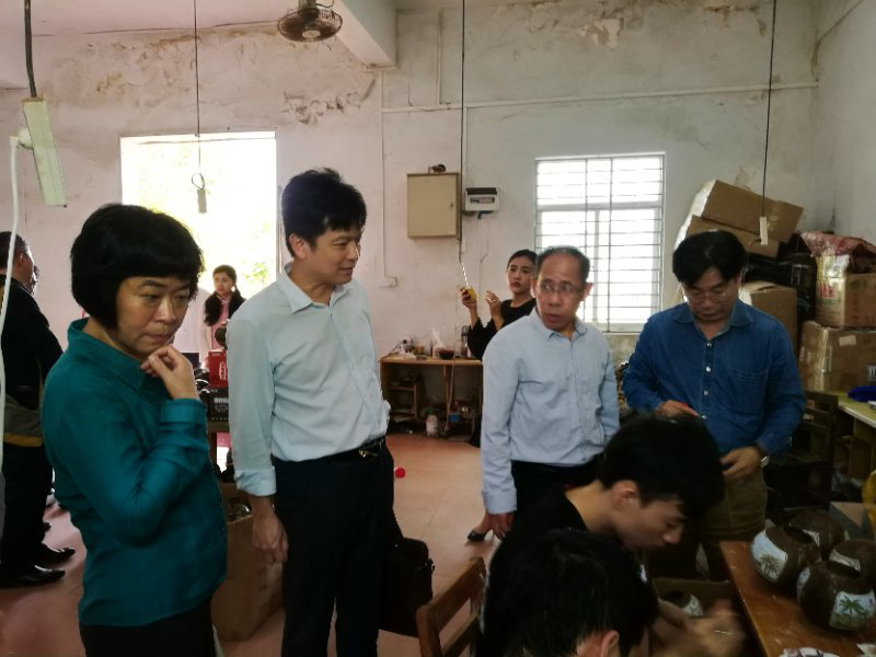 2018年3月16日下午,海南省文体厅非遗处领导刘实葵处长、鲁时忠处长、海南省群众艺术馆副馆长陈光海、我校宣传部郭志东部长、继续教研部林春光主任、美术系主任符祥康、副主任周乃林以及一行教师对我校非遗培训项目的场地、设备进行了实地考察。一行领导实地考察了美术系教学楼、北门手工实训基地、非遗传承人吴名驹工作室。美术系符祥康主任向各位领导介绍了我校申遗项目的筹备情况、椰雕、黎陶、木雕课程设置。每到一处,领导都认真询问各个实训教学的相关情况、非遗项目准备情况,了解到非遗工作中的具体问题和困难。
