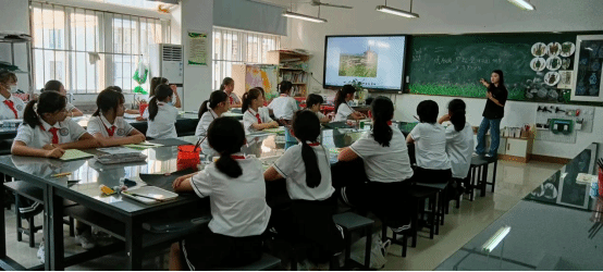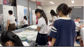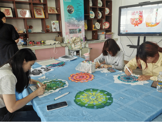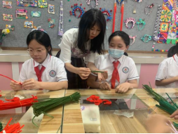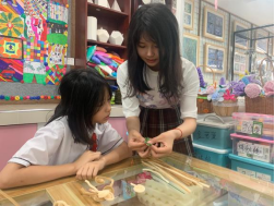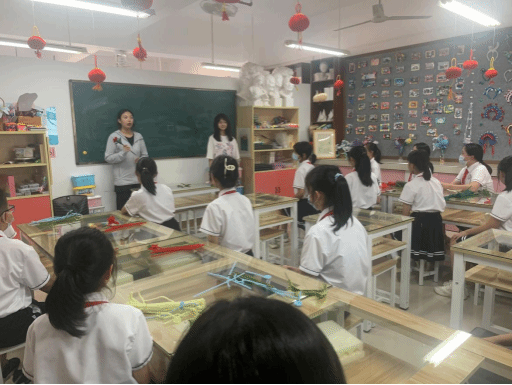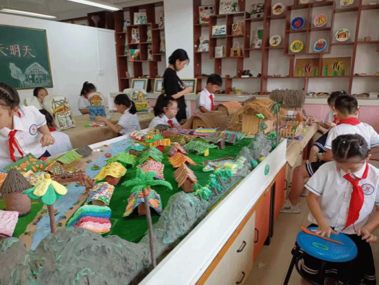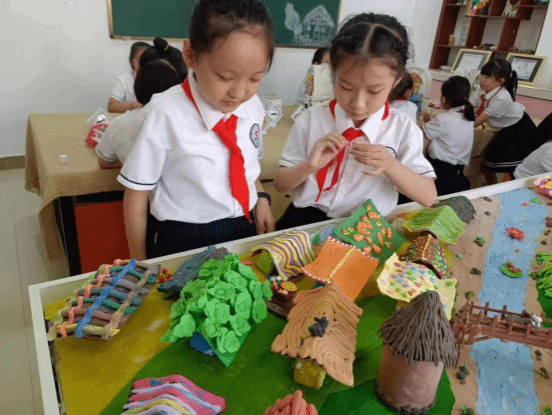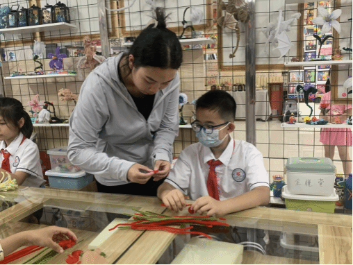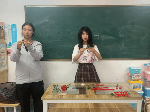 《创意美术》课上,两名“小老师”配合默契,耐心指导学生完成扭扭花的制作