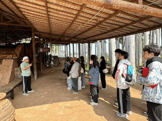 在红坎岭陶艺园的实践考察过程中,负责人首先热情的向学生介绍了阶梯窑的由来以及使用方法,以及其与学校里的电窑以及天然气窑的区别。
