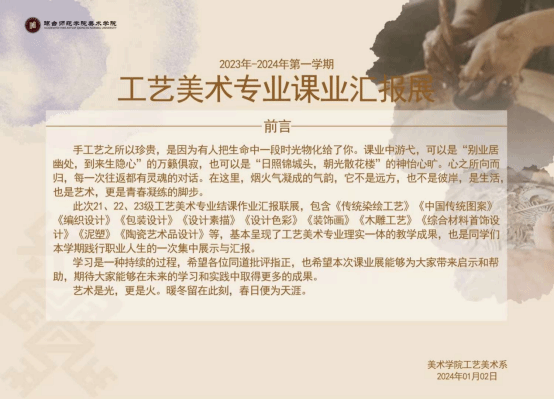 2024年1月2日,琼台师范学院美术学院美术馆举办了2023-2024学年第一学期工艺美术专业课业汇报展,工艺美术专业全体教师和学生均参与了布展。