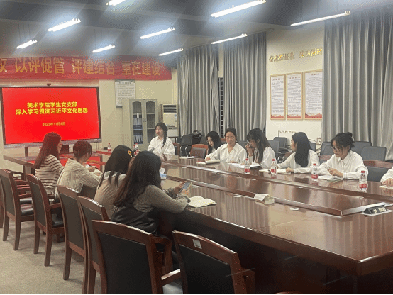为坚持以习近平新时代中国特色社会主义思想为指导,全面贯彻党的二十大精神,深刻领悟“两个确立”的决定性意义,增强“四个意识”、坚定“四个自信”、做到“两个维护”,更好担负起新的文化使命,美术学院学生党支部于2023年11月9日组织全体学生党员认真学习贯彻习近平文化思想。