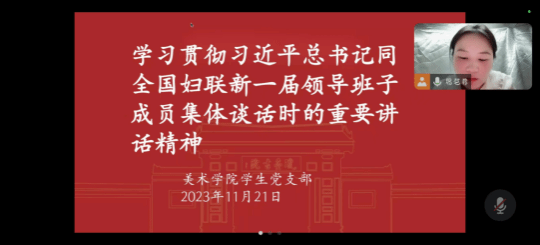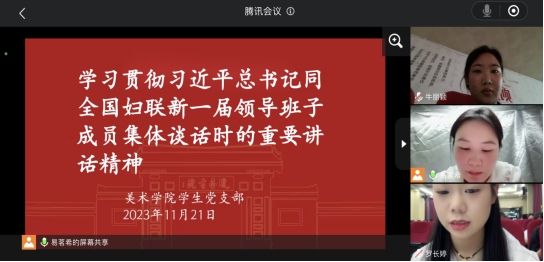 为深入开展学习贯彻习近平新时代中国特色社会主义思想主题教育,11月21日美术学院学生党支部在腾讯会议集体召开了学习贯彻习近平总书记同全国妇联新一届领导班子成员集体谈话时的重要讲话精神专题学习会议。