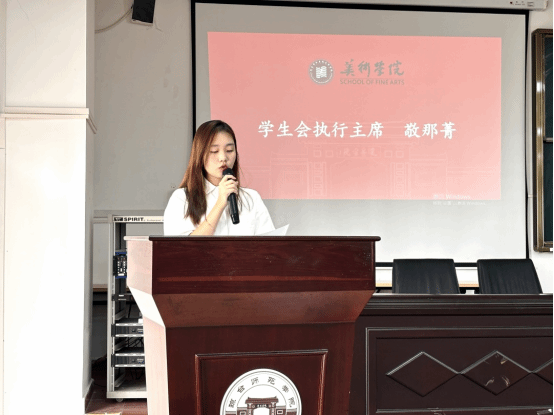最后学生会执行主席敬那菁由衷希望同学们在工作上保持较高的思想觉悟,同时学好专业知识的同时,争取做一名优秀的学生干部,为美术学院的发展贡献自己的一份力量。