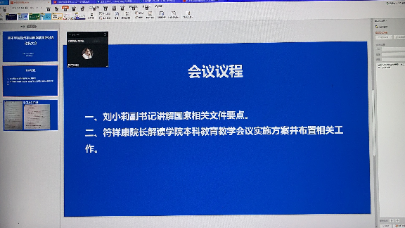 本次会议全体教职工参与,会议议程分为两项:1.刘小莉副书记讲解国家相关文件要点。2.符祥康院长解读学校本科教育教学会议实施方案并布置相关工作。