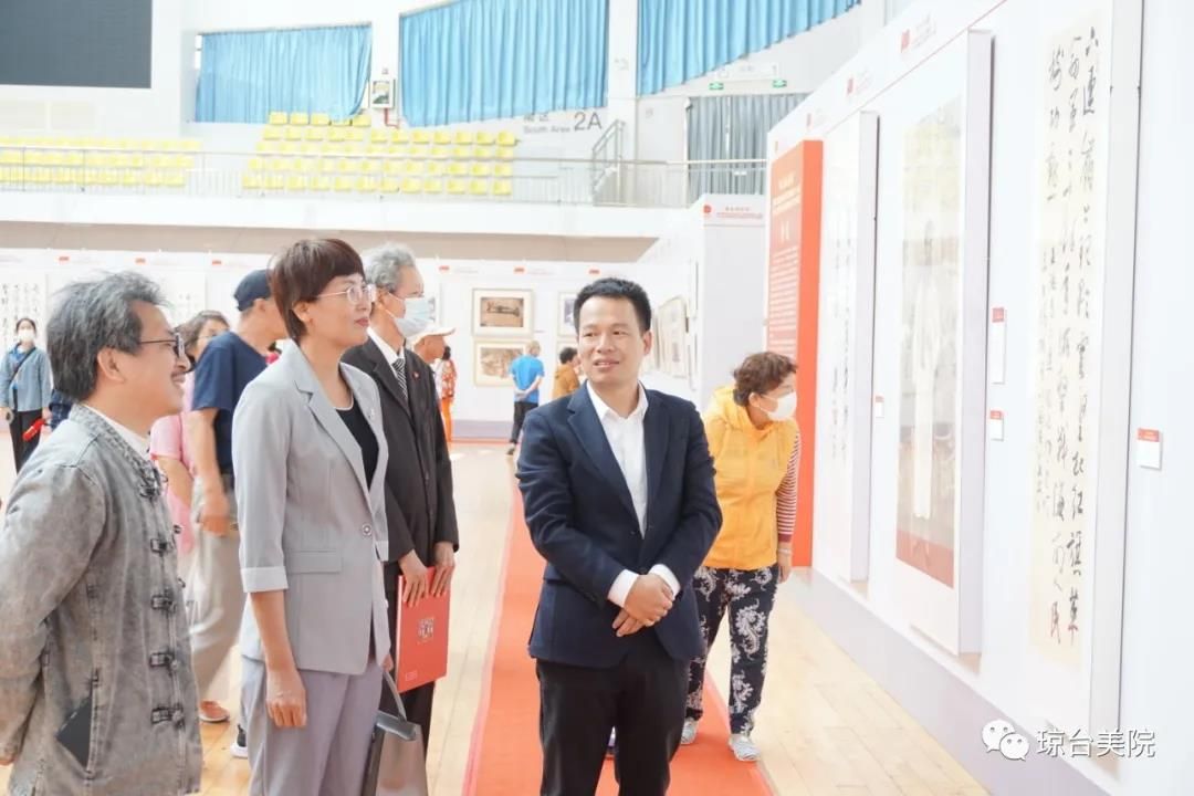 中共陵水黎族自治县委宣传部常务副部长吴宗伟,琼台师范学院党委副书记陈晖阳,琼台师范学院美术学院院长符祥康在展厅观展