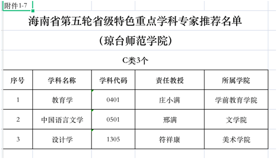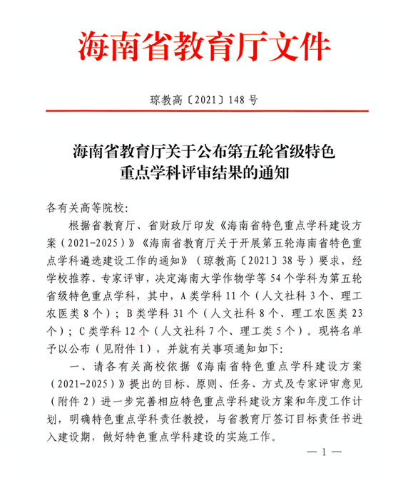 根据海南省教育厅、省财政厅印发《海南省特色重点学科建设(2021-2025)》和《海南省教育厅关于开展第五轮海南省特色重点学科遴选建设工作的通知》(琼教高[2021]38号)要求,学院设计学学科在认真梳理近年来专业建设成果基础上,组织申报特色学科。2021年9月,海南省教育厅文件(琼教高[2021]148)号-关于公布第五轮省级特色重点学科评审结果的通知,获批为省级特色重点学科,特此祝贺!