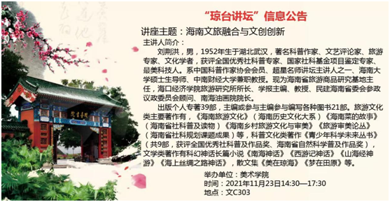 2021年11月23日下午,琼台美术学院工艺美术系在文C303开展了题目为《海南文旅融合与文创创新》的讲座。本次讲座由著名科普作家、文艺评论家、旅游专家、文化学者刘荆洪教授主讲,刘荆洪教授现为海南省旅游商品研究基地主任,海口经济学院旅游研究所所长、学报主编、民建海南省委会参政议政委员会顾问、南海油画院院长。