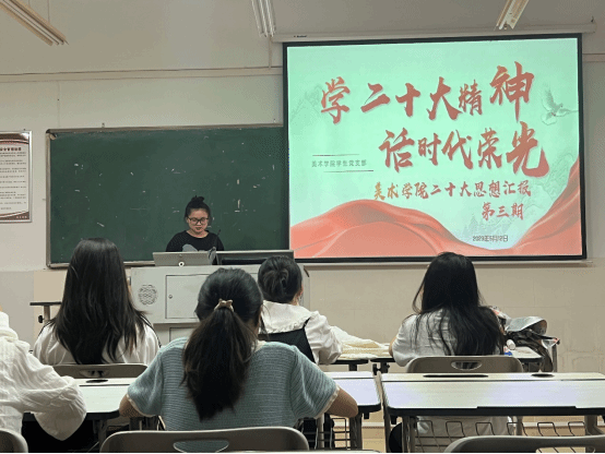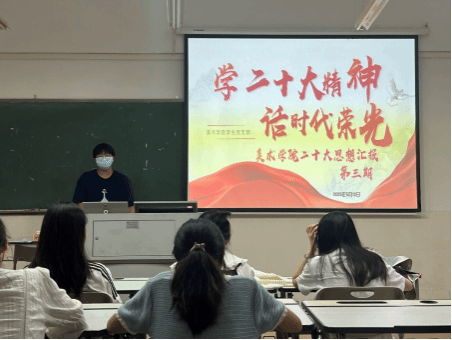 为深刻地理解、体会与学习党的二十大精神,琼台师范学院美术学院学生党支部召开了”学二十大精神话时代荣光”二十大思想汇报第三期主题会议,由党员同志组织入党积极分子在主题会议中做思想汇报,表达与阐述自身对于党的二十大精神的感悟与理解。