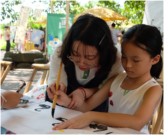 负责第四部分的两个游园区,主要带领师生参与翰墨书香和蒲扇绘画,翰墨书香由书