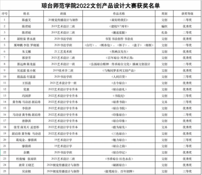 本次大赛以“弘扬琼台精神·传承琼台文化”为主题,结合琼台校情,开拓创新,展示体现琼台书院文化、红色文化和师范文化特征这一主题进行文创设计作品创作。赛事启动以来,美术学院先后通过赛事征集活动,传播大赛声音,激发高校师生设计团队的参赛热情。现场评出获奖作品20余件,大赛作品富有想象力和创造力,向我们展现了其独具特色的设计理念和设计风格,弘扬和传递百年老校琼台师范学院的精神内涵,以实际行动传播琼台文化,面向未来。以下是获奖名单和作品展示。