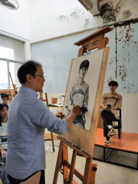 贺羽教授结合素描基础的主题,现场进行了素描人物半身像写生示范教学。从起稿到完稿向学生展示了写生全过程。作画过程中贺羽教授边作画边讲解,由简到繁、由繁入简,将素描写生的心得体会与学生分享,并对学生在写生中容易遇到的共性问题给予了解答。