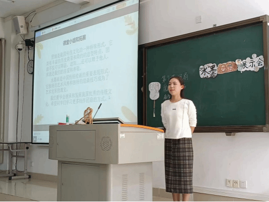 每组同学讲课完毕后,评委们会对学生的课堂展示与整体表现的优缺点进行一一点评,也指出同学们在教学展示终存在的一些共性问题。如需要加强三笔一画的教学基础技能,在板书时对于笔画顺序要严谨、字体大小要和谐、整体要美观。大部分同学的教学示范部分选择视频播放的形式,缺少现场示范与展示,在语速语调等语言表达、与学生的眼神交流、教姿教态等方面还需不断加强。还有个别同学的教学设计不规范,教学内容或过于简单,或知识点较深,这都是对学情尚未形成清晰认知的缘故。在教学时要注重引导学生,巧妙设计提问,充分发挥自己的教学智慧,加强平时的知识储备。