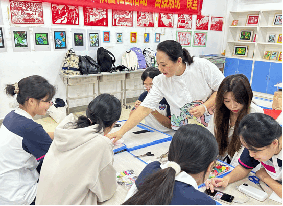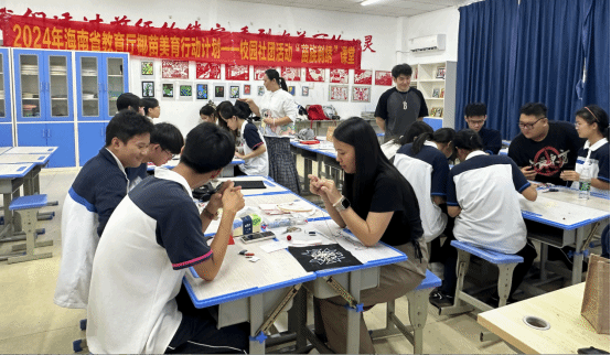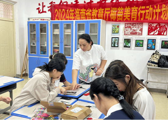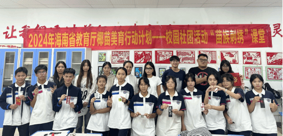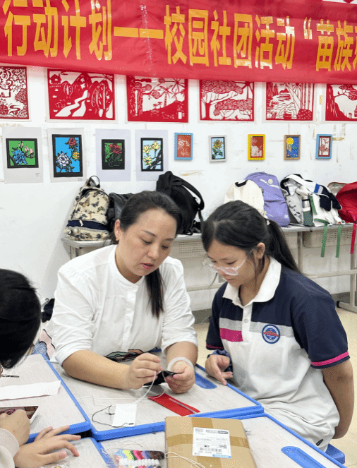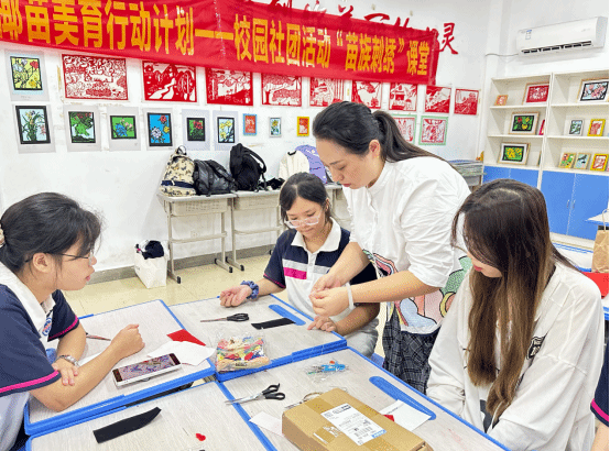 2024年11月4日,同学们在聆听完由吴晨珠老师带来的有关于苗族刺绣的讲座分享后,开展了苗族刺绣动手做的社团活动,在活动中,椰苗美育教学团队的负责教师针对有关于苗族刺绣的素材的选择,草稿的绘制,如何正确的穿针引线,绣出工整精美的苗族刺绣,对同学们进行全方位细致的指导。