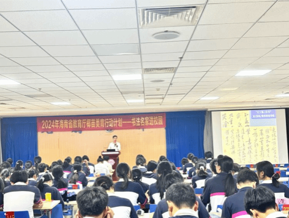 10月26日上午9:30,椰苗美育教学团队于华二附中乐东黄流中学学校大礼堂,开展美育进校园活动,琼台师范学院美术学院沈速教授开展题为“翰墨启智·书画润心——书法名家进校园”的学习讲座。