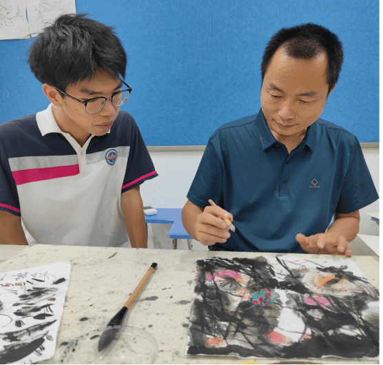 在绘画过程中,周教授对每一位同学的绘画进行细心指导和示范,从如何绘画有力度的线条,惜墨如金,墨色晕染,为同学们逐一做示范演示,确保同学们可以理解并大胆运用,自由地去绘画。