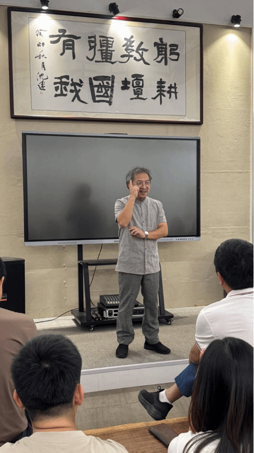 美术学院副院长周乃林在讲话中,特别赞赏了谭炜睿将书法元素创造性融入不同载体的尝试,并鼓励在场书法系学生以此为榜样,勇敢向自己的艺术目标靠近。