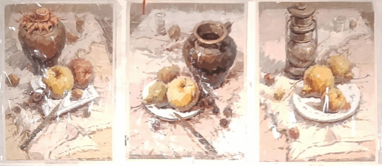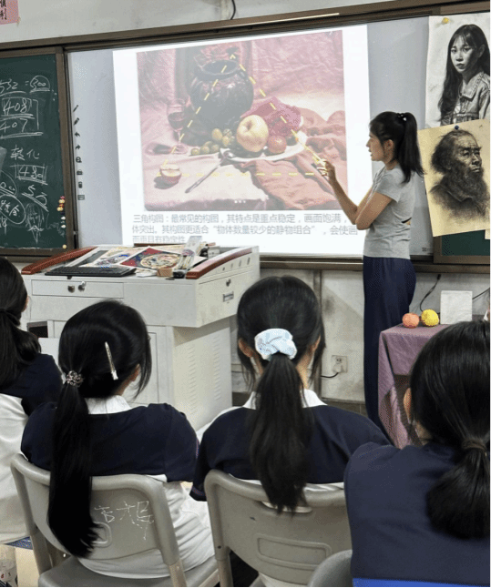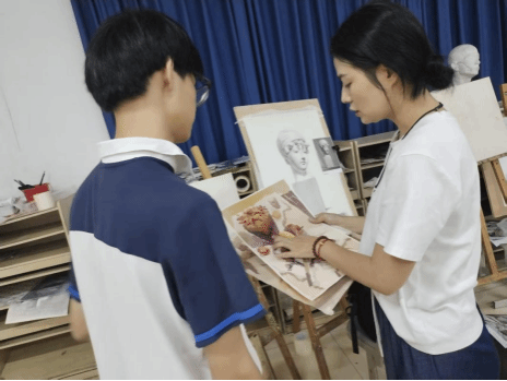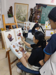 进入实践练习环节,学生们围绕联考常见静物组合展开色彩创作,张蕾老师立即开启“一对一”巡堂辅导模式。她穿梭在学生画架之间,俯身观察每一位学生的作画过程,及时发现问题并给出针对性建议;遇到作画思路卡顿的学生,她会停下脚步,拿起画笔在画纸上辅助勾勒色彩过渡层次,耐心讲解“如何通过色彩明度变化体现物体体积感”;对于颜料调配不熟练的学生,她还现场示范调色比例,切实解决学生创作中的即时难题。