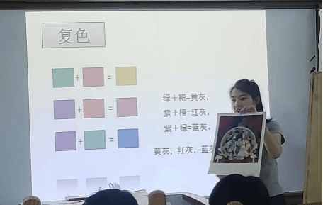调色原理正是构建精准色彩关系的关键。她先从色彩基础理论讲起,系统梳理“三原色(红、黄、蓝)、间色(橙、绿、紫)、复色(如橙红、蓝绿)”的调配逻辑,强调“所有复杂色彩均由三原色按不同比例混合而成,掌握比例就能控制色彩纯度与明度”。