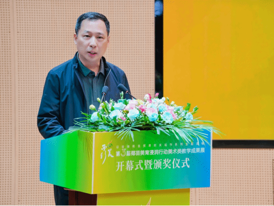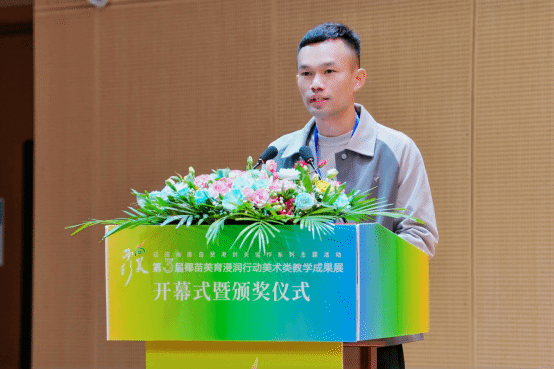 在“向美而行”第三届椰苗美育浸润行动计划美术类教学成果展开幕式上,优秀指导老师代表、来自琼中黎族苗族自治县红毛小学的吉家岛登台发言。他满怀激动与荣幸,称这份奖项不仅是对个人教学工作的认可,更是对全体教育同仁辛勤耕耘的致敬,也是对学校教育事业蓬勃发展的见证。