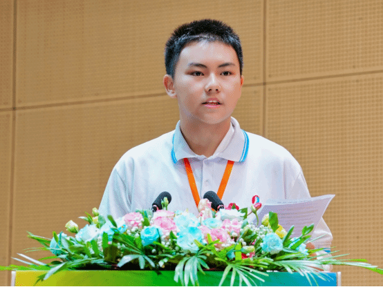学生代表周泽厚分享了自己幼时因好动,被母亲引导学习书法,十年间在临帖书写中体会到书法不仅是技艺,更是与心灵对话的方式,学会纯净、耐心,感知到一笔一画的温度的经历。他认为“椰苗美育”如家乡温柔的海风,滋养着青少年成长。