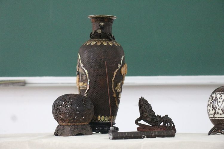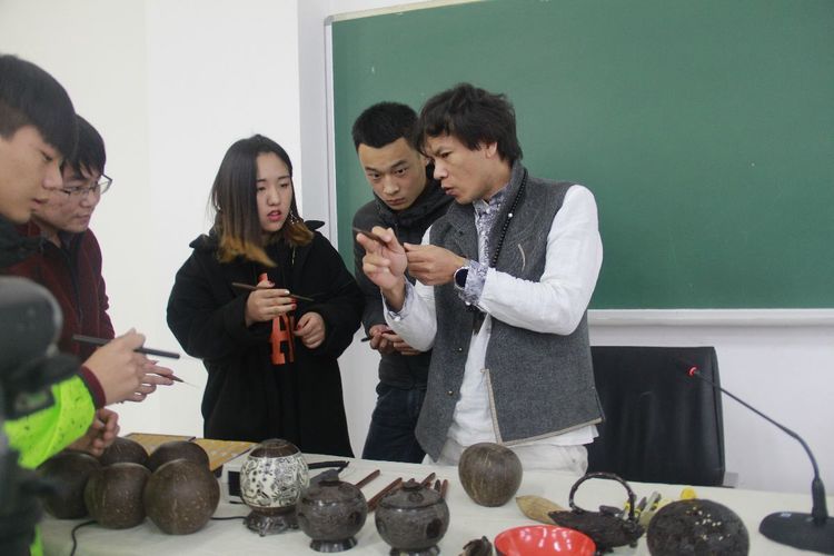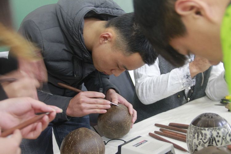在下午的实际操作互动部分效果非常好,通过一个原材料椰壳在短短的2个小时演示成型,同学们热情高涨,一听说吴老师还能免费招收学徒学习,报名就达到了20人的规模。