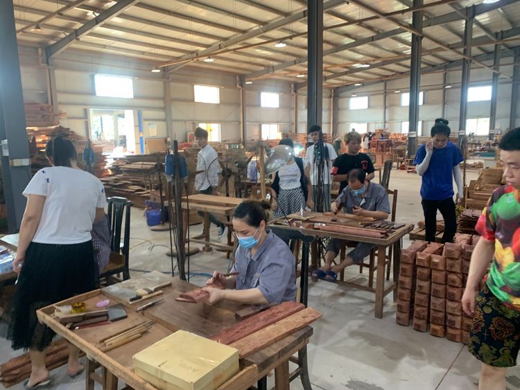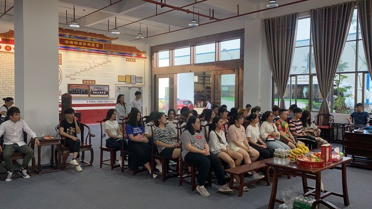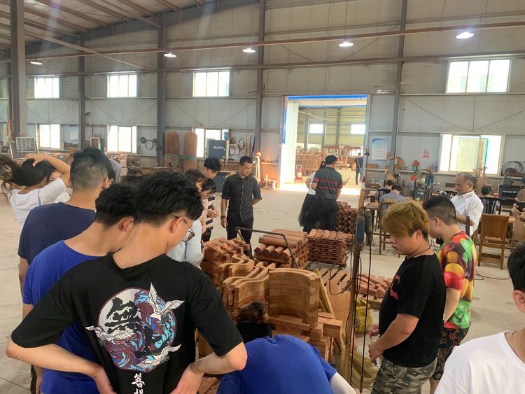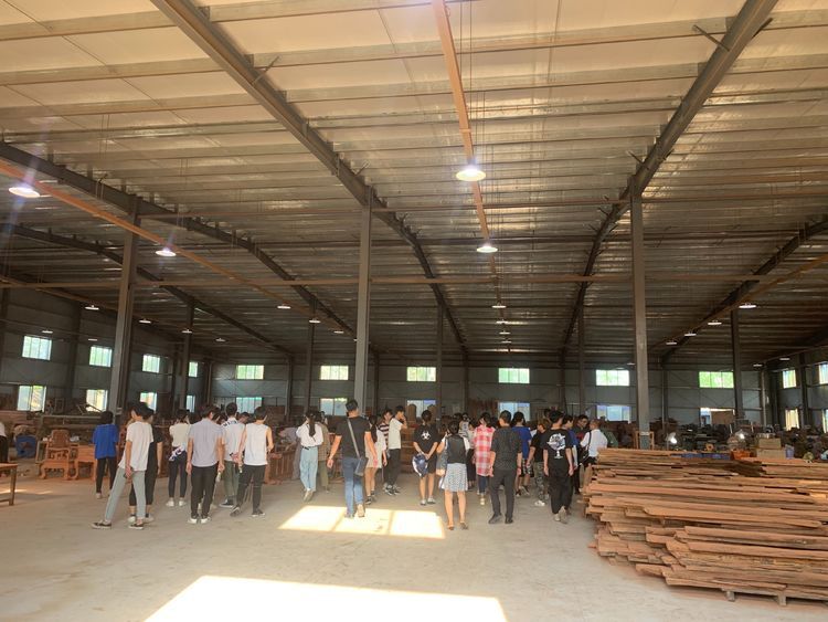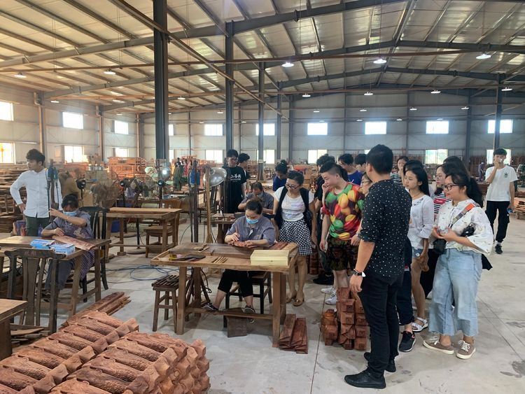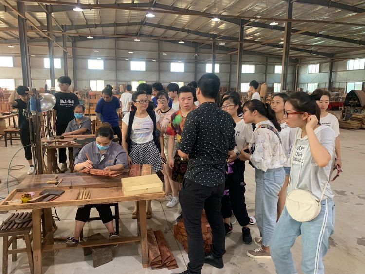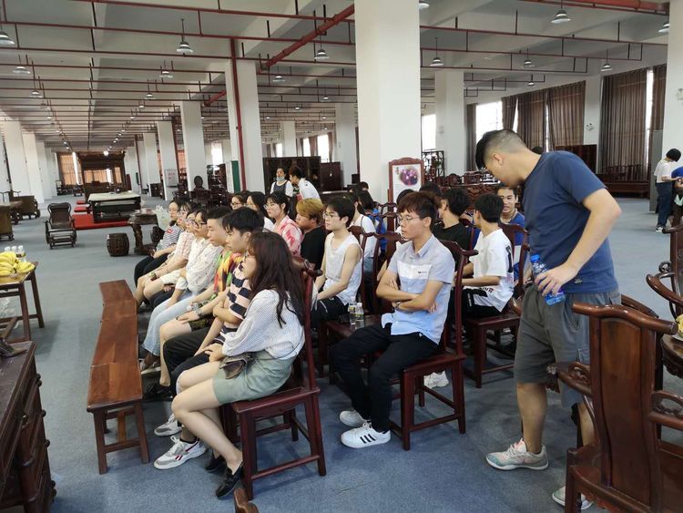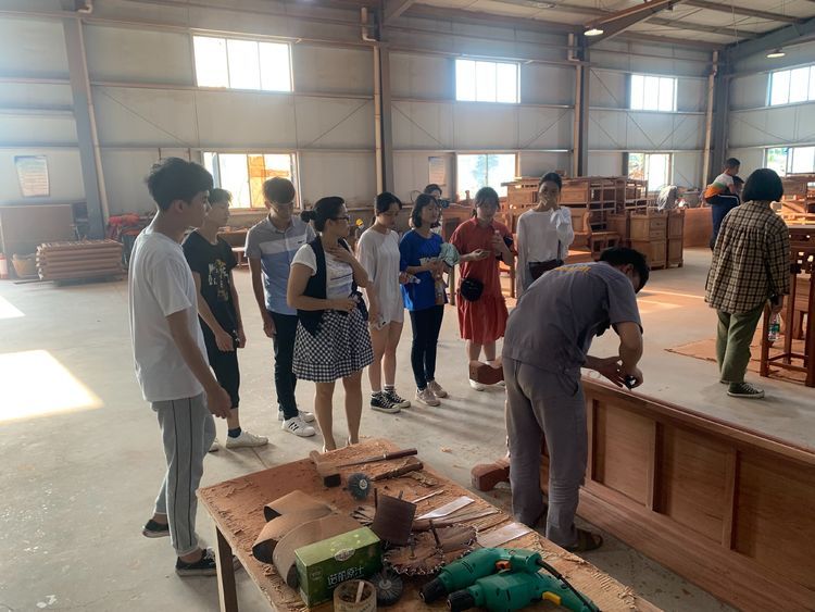 师生们在企业专家的带领和讲解下认真观看、学习工人们做的家具