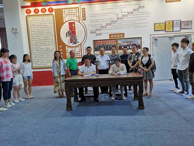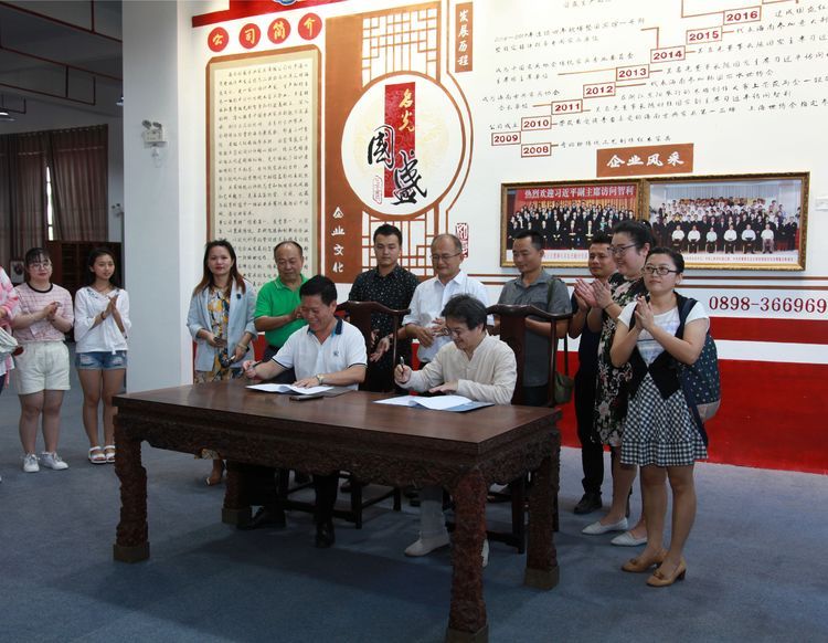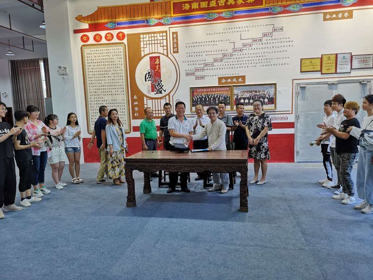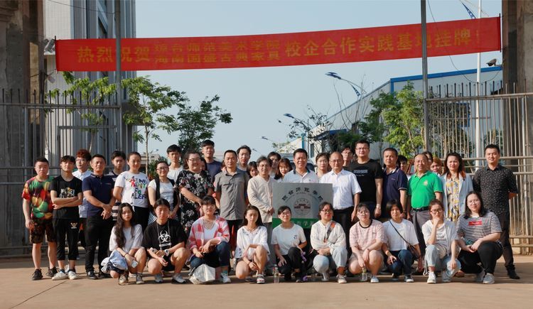 为深化产教融合、校企合作,促进校企之间的沟通交流,探索校企合作的长效机制,3月20日下午四点,琼台师范学院美术系与海南国盛古典家具公司在国盛古典家具产业园举办了校企合作签约挂牌仪式,琼台师范学院美术系主任符祥康、海南国盛古典家具公司董事长吴名光代表双方签订了合作协议。美术系书记王海清、副主任周乃林、艺术设计专业副主任曹春楠及专业教师吴晨珠、吴天燕、陈益阳,海南省古典家具协会秘书长马浩,国盛部分公司高管,美术系18工艺美术专业学生们参加了签约挂牌仪式。